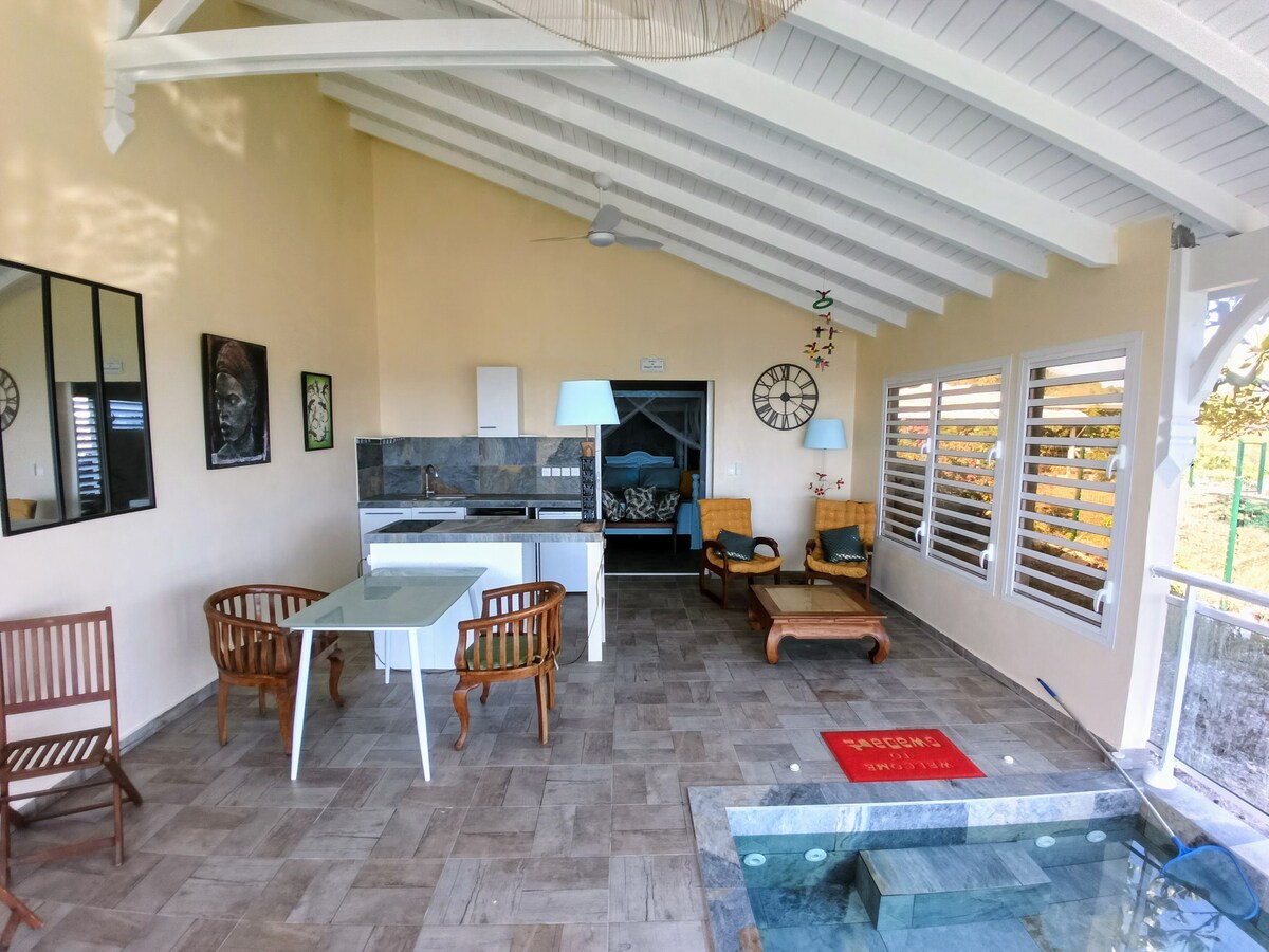 "Le Colibris Amoureux" vous propose son loft de luxe indépendant, offrant une vue spectaculaire sur le lagon. Ce lieu est parfait pour ceux cherchant à se relaxer tout en contemplant la mer, la Dominique, les Saintes, ainsi que le littoral de Marie-Galante. Le loft se compose d'un grand espace de vie qui inclut un salon et une cuisine toute équipée, une piscine balnéo privée, ainsi qu'une vaste chambre climatisée dotée d'une salle de bain en suite et de toilettes séparées.