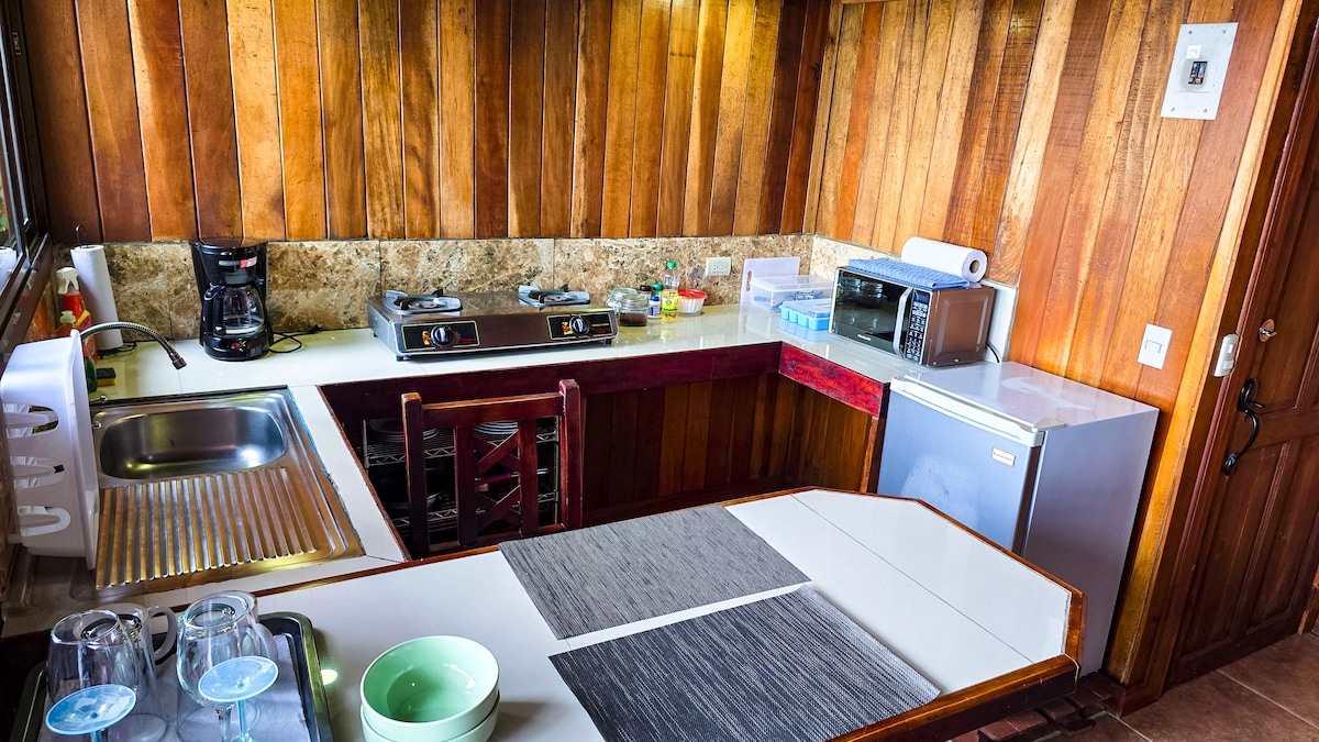 Hand-made Bungalow with an amazing sea view. The Chalet includes 1 king size bed, a living room with twin beds, bathroom and kitchen area with a coffee maker and coffee. You can ask for a home made local breakfast (extra cost) The Chalet is located on a hill, meaning you will you need to walk 50m up to access the house. Your car will stay at the parking lot down the hill. We are located - 400m from playa Manzanillo - 3km from playa Rajada/El Jobo/Copal - 19km from La Cruz
