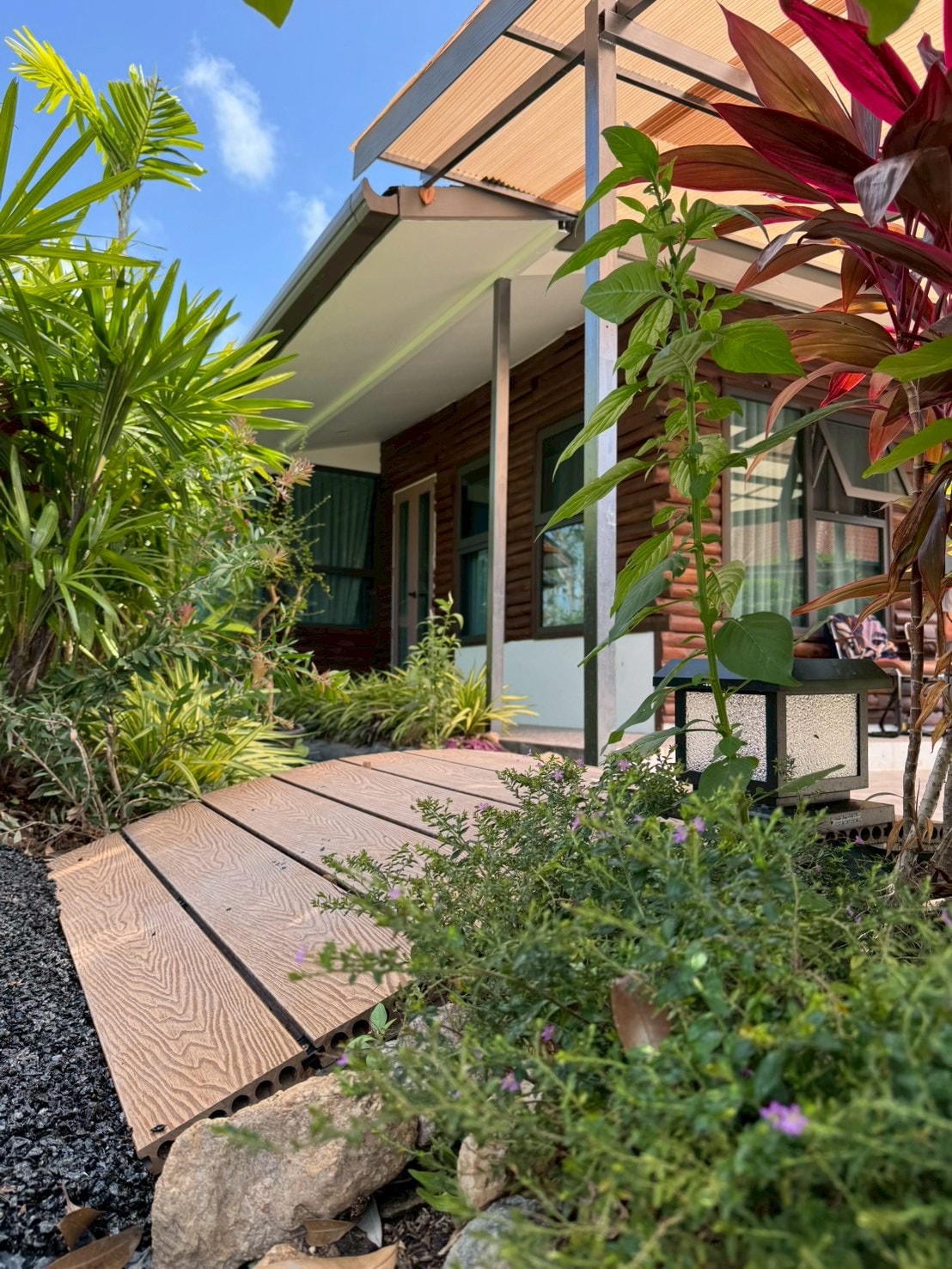 Measured 21ft by 27ft, this one bedroom cottage is the latest addition to our existing Pondok Keladi Guesthouse Langkawi. It also features ensuite bathroom, an open living room and fully-equipped kitchen overlooking the lawn and jungle. Very private. And we have 4 lovely cats roaming around freely on the property from 7am to 5pm.
