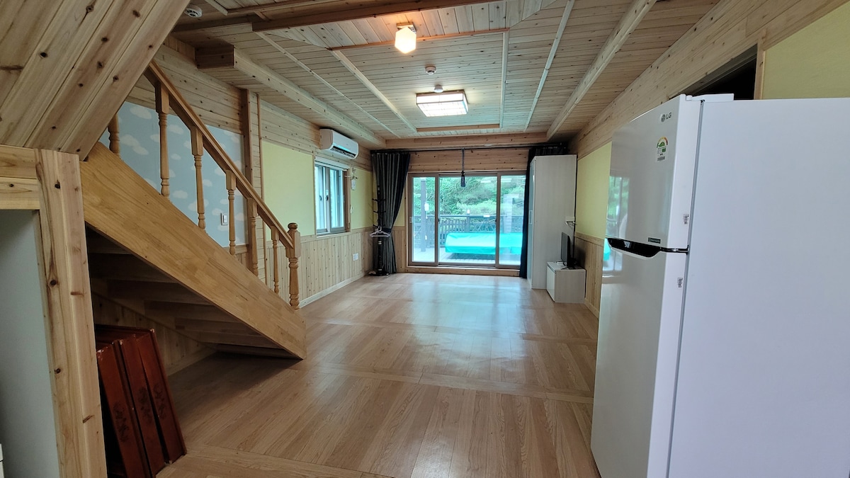 Harang Naye is located in the clear air of Baegunsan Mountain and where the valley flows. This is a quiet and small accommodation Stay. As a building, units 101 and 201 are divided into separate entrances. If you are a family, you can use it as a private house. The two rooms are equipped with amenities such as each open-air bath, spacious terrace, and beam projector. For a pleasant and safe environment for our guests, the charcoal barbecue We don't prepare it, but you can prepare grilled foods with zaigles, etc. We've arranged for you to cook and eat food outside.(Free rental: burner, grill, gas, etc.) Room 201 is a loft-style interior with a staircase to the bedroom and terrace. You have been able to use it. Relax with a family or lover in a tranquil home Take it:) ※ Guests at various gatherings such as friends (social) are politely declined. * Possession of complaints, damage, property damage, etc.