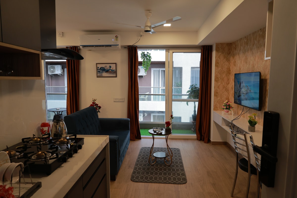 Step into 404 Luxe Haven, a thoughtfully designed 404 sq.ft studio apartment blending modern comfort, warm lighting, and elegant interiors. Featuring a signature mustard velvet sofa, a cozy queen bed framed with floral backlighting, a stylish modular kitchen, and a relaxing balcony with greenery, this space is perfect for singles, couples, or business travelers. Enjoy a peaceful ambiance with contemporary décor, soft neutral tones, and every essential curated for a seamless stay.