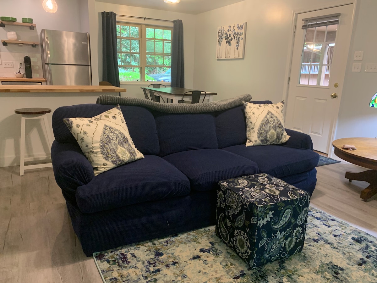 850 sq ft guest house set back from the main road for quiet and privacy. Grocery store and several good restaurants just a mile away. Only 7 minutes to historic downtown main street. Large living area, open floor plan in living/dining/kitchen. Plenty of space for four people. Extra large bedroom with a luxury king bed.