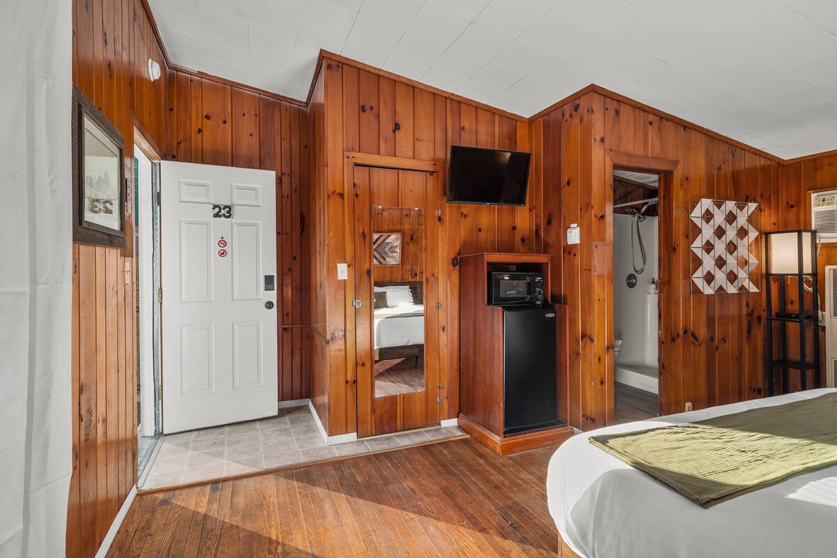 Traditional hotel accommodation that includes a king bed, private bathroom and air conditioning/heating. These rooms feature a shared balcony with the adjacent room that overlooks into a courtyard area or a parking lot. Our hotel rooms do not have a view of the lake. Please note there is not a TV in the room.