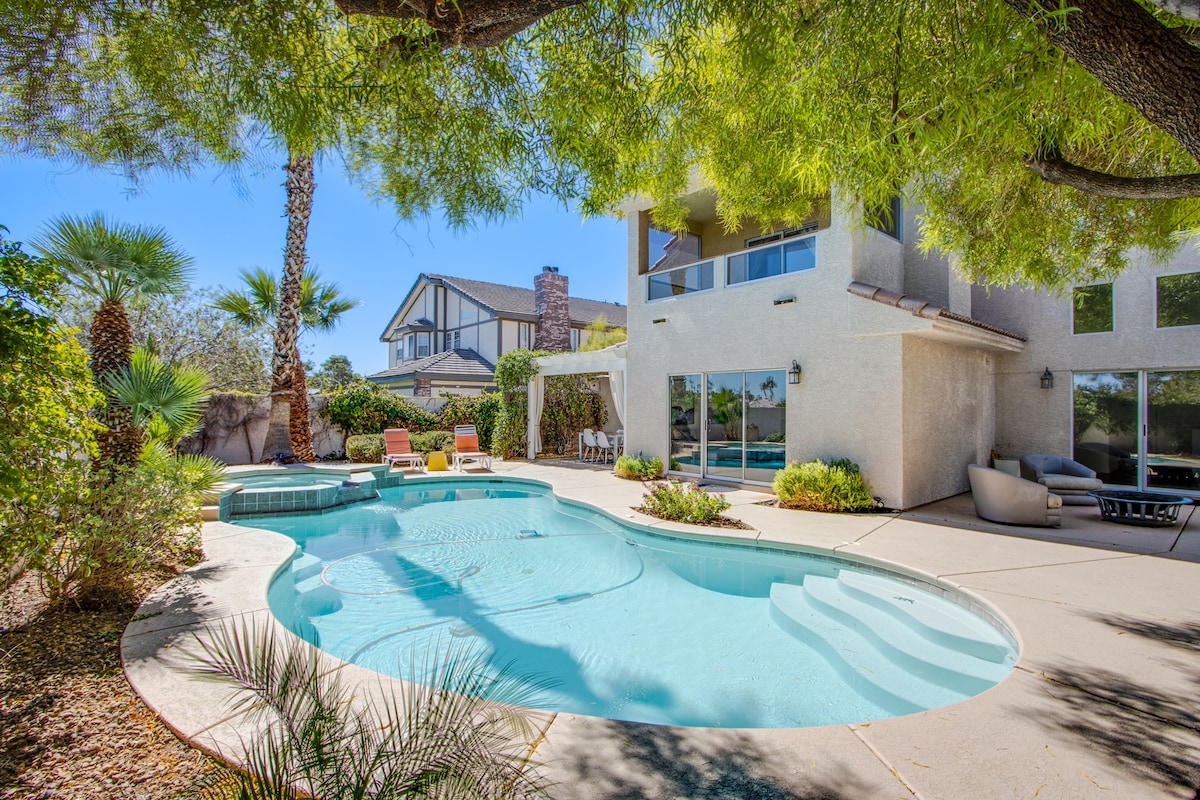 Escape to Vegas in our stunning 5-bedroom villa with soaring ceilings, cozy fireplaces and abundant natural light. Enjoy a resort-style pool heated free year-round, hot spa, outdoor kitchen, ping pong, pool table and games. Perfect for friends getaways, work groups and families -- the best of Vegas without the chaos. This oasis is 15 minutes from the Strip or airport, near hiking, biking and climbing, school and collegiate sports, Red Rocks, Lake Mead and Hoover Dam. Pets welcome.