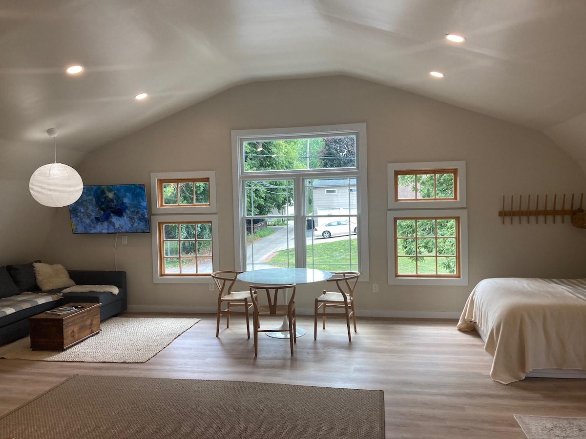 This memorable place is anything but ordinary. Enjoy the simplicity of Scandinavian design in a spacious, light- filled studio guesthouse. Everything has been newly renovated and attention to detail has not been spared. This studio features: a mid century gas fireplace, gourmet kitchen, tiled in shower with heated bathroom floors. There is also garage parking available, an outdoor fire pit, and bicycles to enjoy. Centrally located, walking distance to quaint downtown Hopkins.