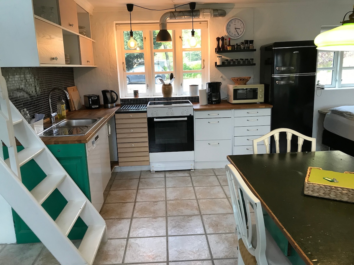 Cozy annexe, situated beautifully at Ollerup lake. The annex was built in 2021 with raw brick walls and wooden ceilings, which gives a very special atmosphere. There is a new 140x 200cm bed in the living room, as well as a loft with the possibility of 2 overnight guests. There is a private entrance, large wooden terrace and access to Ollerup lake and garden. You can borrow a rowing boat. Kitchen: There are two hotplates, fridge with small freezer, fully equipped kitchen.