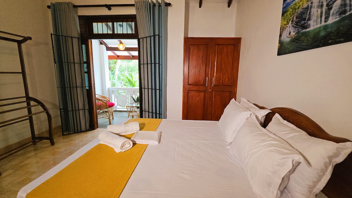 This is a luxury house located a short drive from Hikkaduwa situated in a quiet meadow. What we offer here is a three-story house which consists of four bedrooms, three bathrooms, open pantry with all amenities. Large living areas and a dining space, with multiple balconies. The house is also surrounded by a large garden for guests to enjoy. It is a very private house which is family friendly. No pets allowed inside the property, pets only allowed outside, in garden.