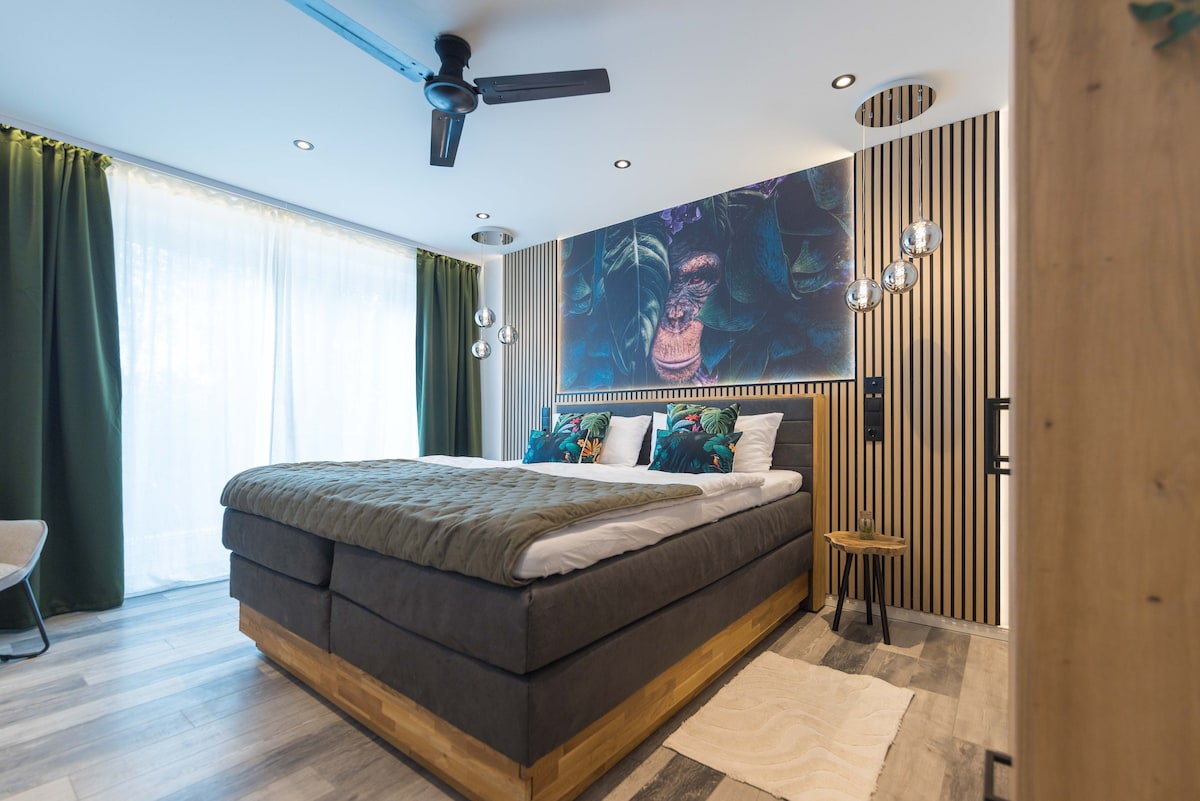 Living in a Gründerzeit house: Unique, cozy & a bit more beautiful! The modern loft apartment is located in a beautiful Gründerzeit house in the Hof city center. Pedestrian zone and train station are each only a few minutes walk away. The loft has a kitchenette, a queen-size bed, an en-suite bathroom with a free-standing bathtub as well as a floor-level shower. The ceiling spotlights can be adjusted in color to create an individually cozy ambiance for bathing.