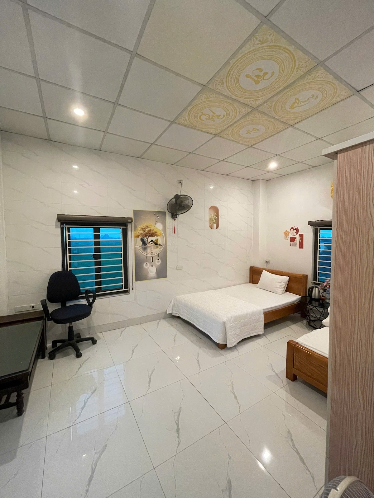 The Studio Room in the 4-story house has a total of 5 bedrooms and 6 fully air-conditioned bathrooms, a fully equipped kitchen and a self-contained laundry room located near the top attractions. + 7-10 minutes drive to Hoa Lu Ancient Town, square Ninh Khanh Square, Ninh Binh Sports and Fitness Stadium... + 20-minute drive to the top of famous tourist destinations Tam Coc Bich Dong, Trang An Hoa Lu, Mua Cave..... + many local restaurants and convenience stores in the neighborhood ** Free on-site luggage drop-off and parking available