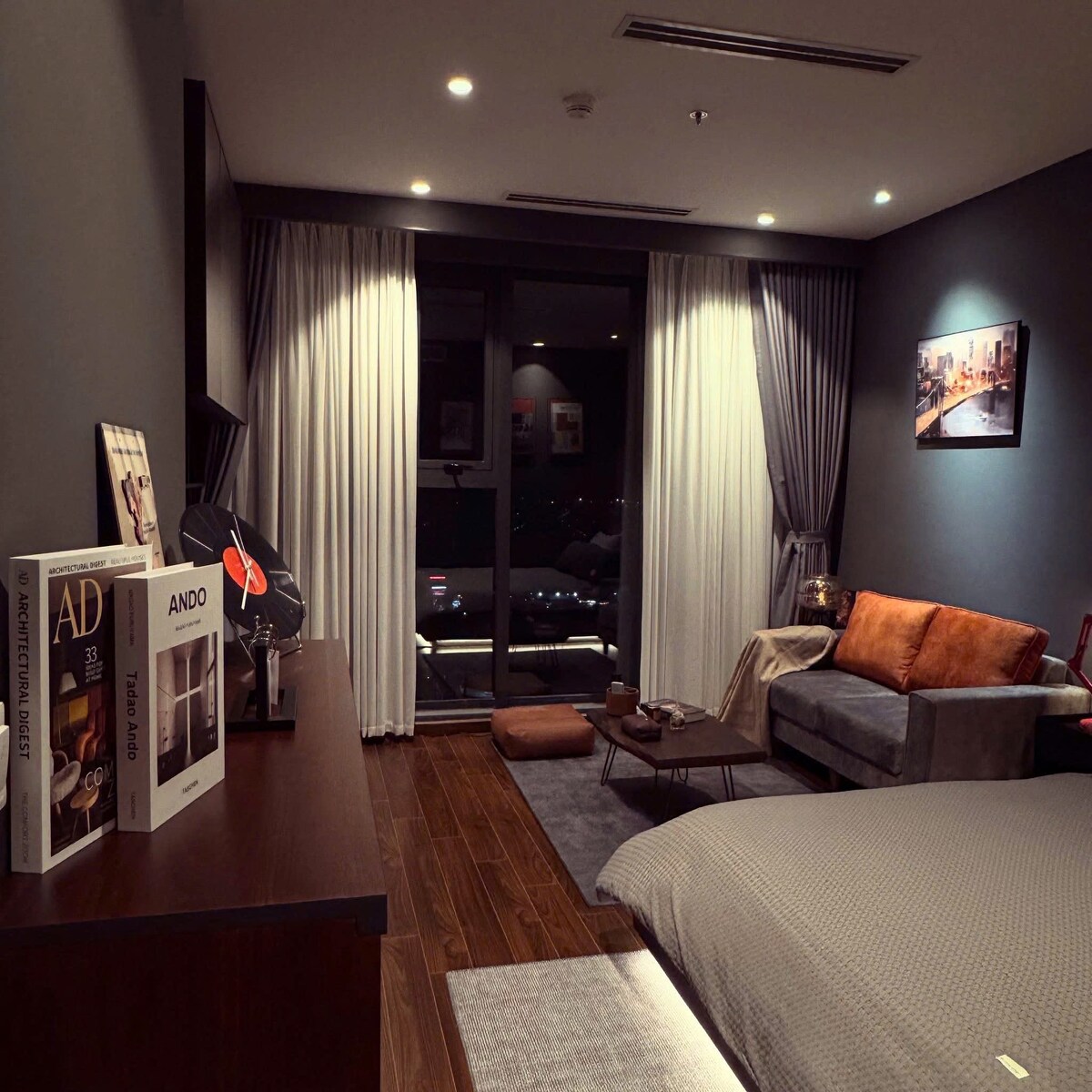 Modern apartment in Vinhomes SmartCity with large glass doors, open lake view and natural light. Fully furnished: soft bed, kitchen, washing machine, high-speed Wi-Fi. The kitchen area is fully equipped with cooking utensils, pots and pans, basic spices. Relax with a large projector, watch Netflix in your room. Suitable for foreign guests, short-term business travelers or relaxing retreats.