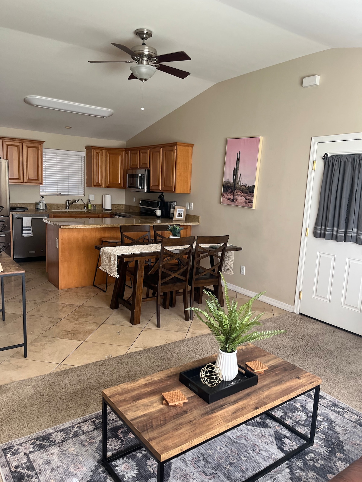 Completely remodeled darling 1 bedroom separate upstairs apartment is COOL, quiet, private and spacious. Find out why we are known as the "Valley of the Sun" as you enjoy breathtaking sunsets on your patio overlook! Then head inside to watch a show on our HUGE 70" with some fun movie snacks we provide for you.. We are located minutes from the Spring Training Facilities, golf courses, restaurants and grocery. Hiking is just around the corner as well. Come stay in our home away from home.