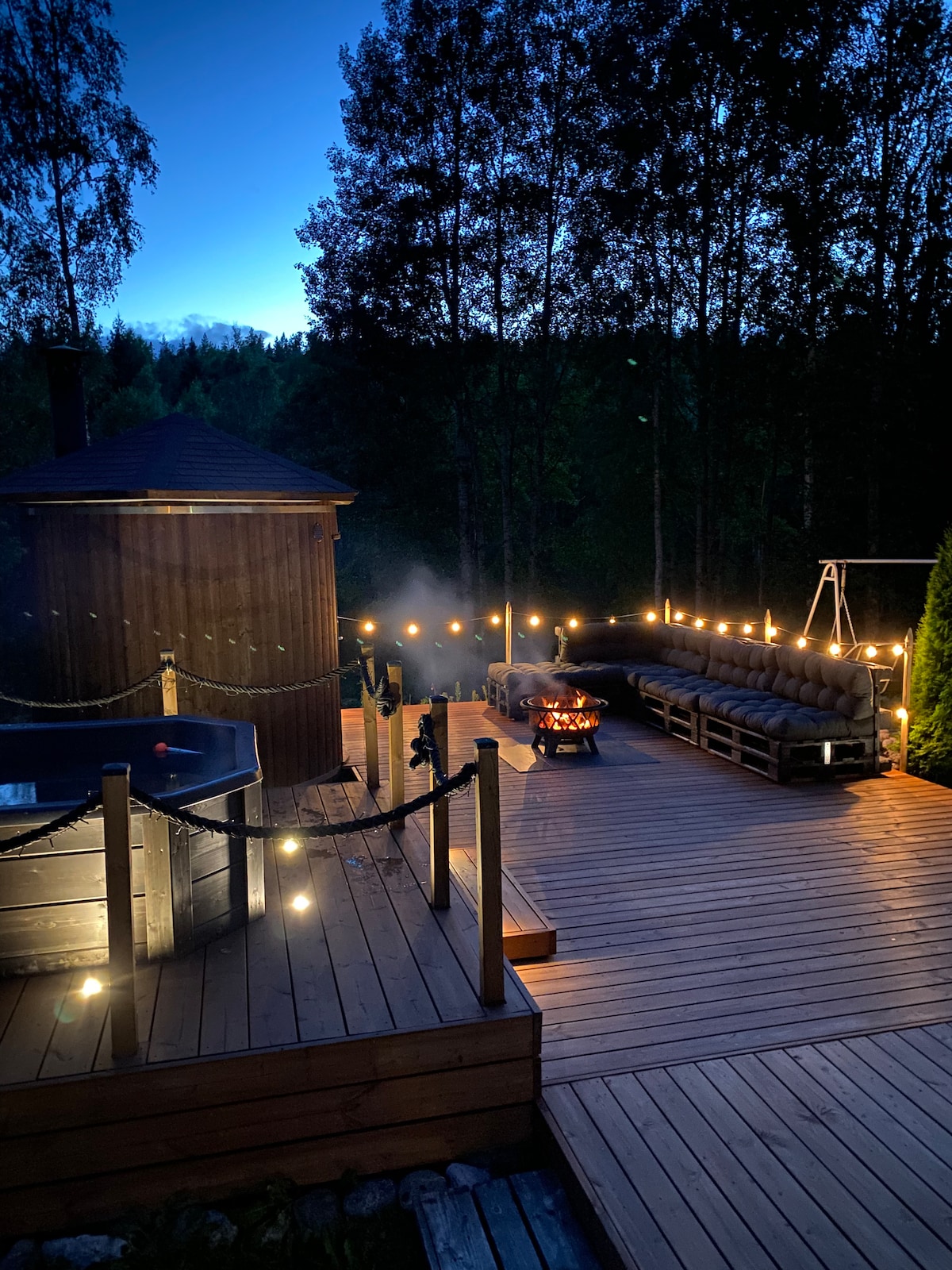 A lovely cabin on the shore of Kalkkistenkoski. On the terace you can grill, eat, enjoy the evening sun, lounge on the deck chairs or see the local bird populations. The cabin also has a sauna, hot tub and an indoor fireplace. The cabins kitchen has the essentials for cooking and the barbeque and outdoor fireplace can also be used for cooking. The kitchen and sauna have warm water and drinking water will be delivered to the cabin. The cabin has an outdoor composting toilet.