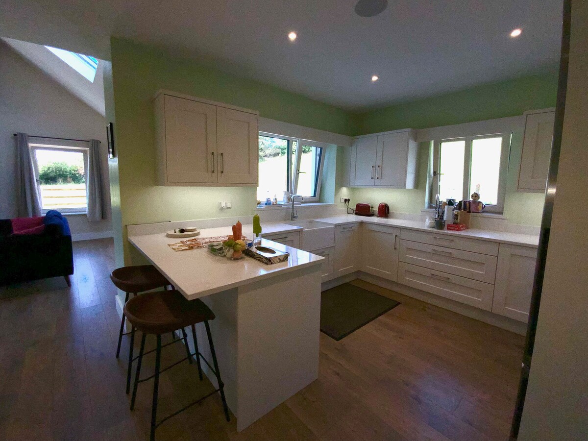 Welcome to my luxurious self-catering apartment at Draíocht na Mara, where comfort meets breathtaking ocean vistas for an unforgettable retreat. I call the apartment 'An Tearmann', which means the sanctuary. Step into a spacious haven designed to cater to your every need. Sink into the plush embrace of a king-sized bed after a day of exploration, enveloped in the tranquility of your private sanctuary. Freshen up in the modern en suite bathroom, complete with towels and a rejuvenating shower.