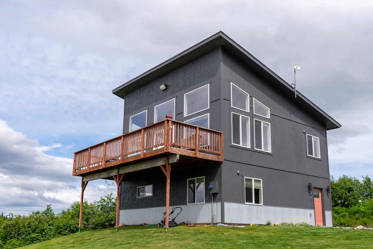 Please come and enjoy our modern and unique vacation getaway! 3 minutes from downtown Homer and 10 minutes from the Homer Spit. Close to town in a quiet neighborhood with views of Kachemak Bay. -1 King size bed -1 Queen size bed -1 twin bed -1 bathroom w/ rain shower -Open concept living area -Space saving staircase -Modern natural gas fireplace -Smart TV -Full kitchen -High speed wifi -Free parking -Key code access -Nordic Spa w/ hot tub, sauna&cold plunge