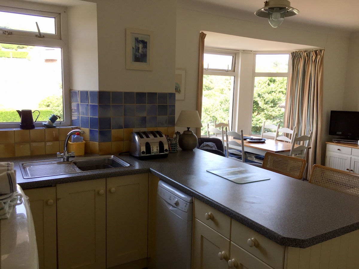 Dog friendly small house 5 mins walk to beach, coast path, pub, cafe, restaurants, village Shop, art gallery/gift shop & The Cottage Hotel Perfect for a family holiday & walking the SW Coast Path Lovely view across valley Communal 2 acres grass area, picnic benches, BBQ Free onsite parking Sleeps 4 Through Kitchen Lounge Ground Floor Shower Room 2 adjoining bedrooms: 1 double & 1 twin (TWIN ACCESSED VIA THE DOUBLE ROOM) Laundry room (washing machine & tumble dryer on paid metre-see photos)