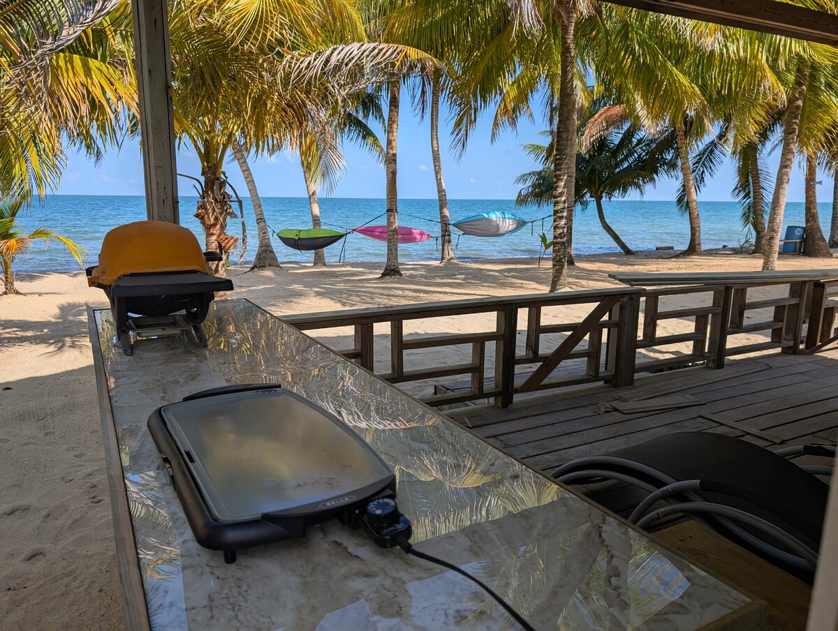 Our Small Cabana (10x14) is barely 60ft away from the Caribbean Sea. A cosy all-you-need budget option equipped with double bed, private bathroom/hot shower, small fridge, coffee maker, fan. In the middle of local life - kids playing in the sea, fishermen cleaning the catch of the day, dogs & chickens running around. Enjoy a cool breeze while on the lookout for Manatees, go swimming or cool off with a nice drink at the bar right downstairs - food and drinks are just a few feet away...