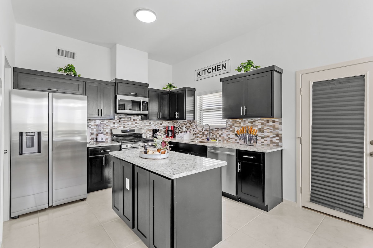 Welcoming spacious Dessert Getaway home. This new 3 bedroom/ 2 full bathroom home will become your "home away from home". This comfortable home is ideal for families & business travelers. Enjoy the open space living room with plenty of space for activities. Whether you need to get work done in the dedicated workspace or have a glass of wine with friends at the island countertop, this home provides space for all. HVAC System Outside Dogs allowed at no cost! NO Pets inside please.