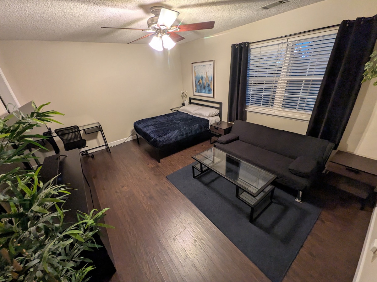 Enjoy comfort & convenience in this spacious master bedroom featuring a full-size bed, desk, walk-in closet, and a private bathroom. Relax on the futon with your favorite shows on the smart TV. Our home is centrally located—just a short walk to Starbucks, Taco Bell, Walmart, & a variety of shops & restaurants. We are a pet-friendly household with professional roommates and one Great Pyrenees named Lulu. Come be our roommie!