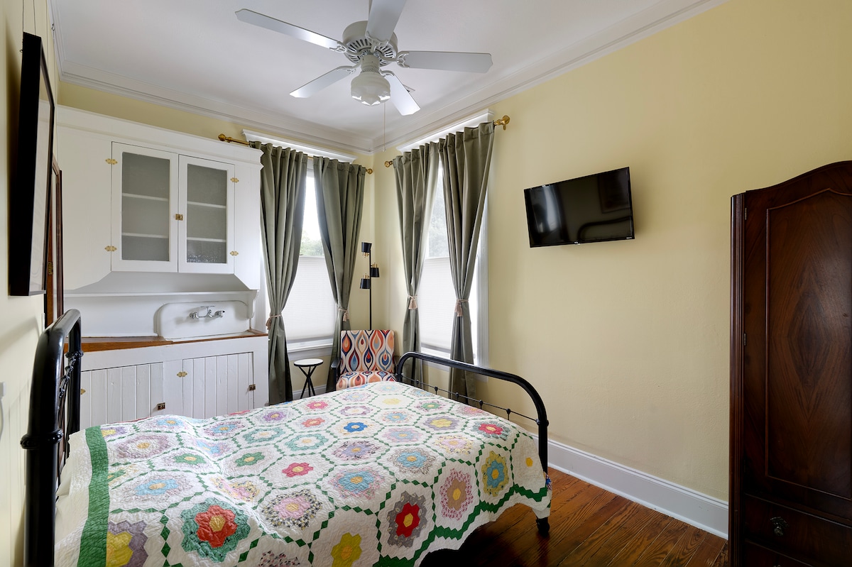The Wildflower Room is a private single room within Yale House B&B, a charming estate that blends historic elegance with modern luxury. The house is shared with other guests. Whether you’re planning a romantic escape, extended stay, or a city retreat, our rooms provide comfort and character in one of Houston’s oldest and most vibrant neighborhoods! Be sure to visit Queen Bee's Tea Room, located on the premises, and enjoy lunch, dinner, and cocktails on the outdoor patio. FREE VALET PARKING