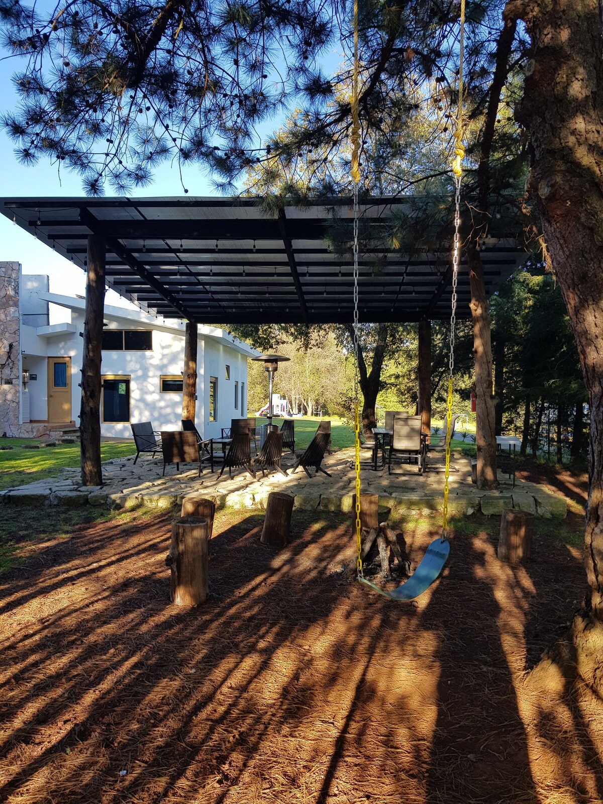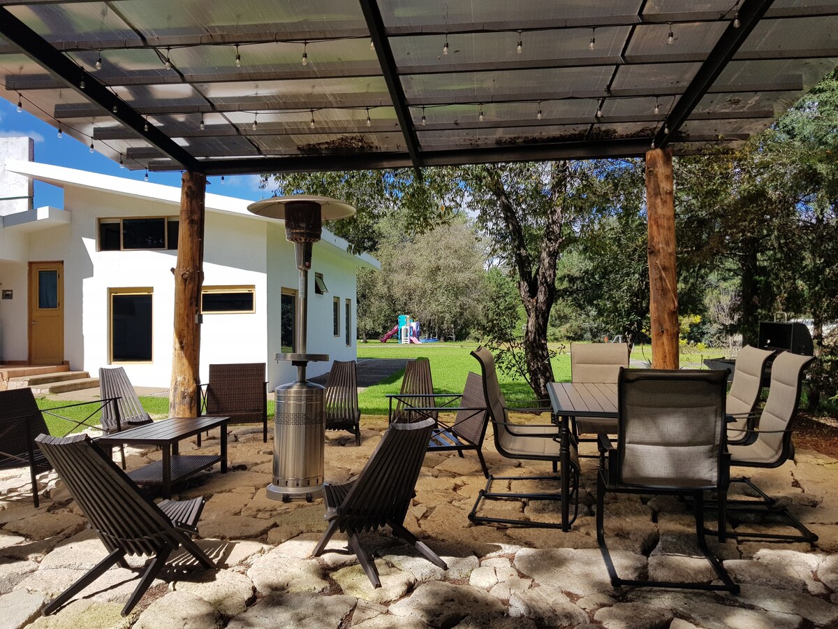 - Relájate en este espacio tan tranquilo y elegante. - Es un lugar muy espacioso para pasar tu fin de semana en compañía de tu familia, disfruta de un juego de billar, con el toque perfecto de una chimenea por la noche y un muy buen desayuno en el jardín por la mañana. - Relajación al máximo en el jacuzzi, en la recamara principal. - Disfruta de la vista y la tranquilidad en el espacio de lectura en la planta alta. - Disfruta de unos deliciosos bombones asados en el fogatero.