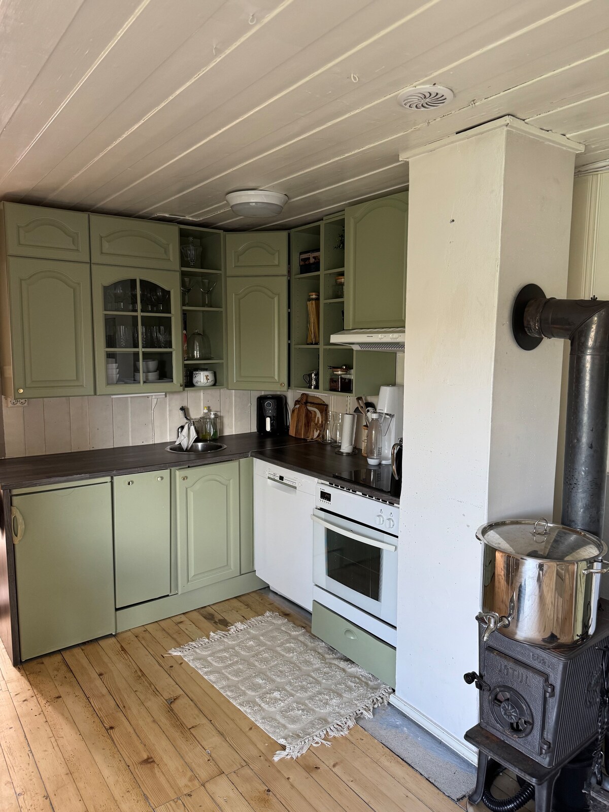 In this spacious and unique place, the whole family will be comfortable. The cabin is located by the water, with its own gate and fenced plot. There is a natural plot in the yard. It is a 100-year-old hand-built cabin that has previously been Høvern school. The cabin is located alone, without view from neighbors. There are good swimming and fishing opportunities. Rented to adult responsible people. Washing, bed linen and towels are included in addition to NOK 200 per person. The road is cleared all the way to the cabin in the winter.