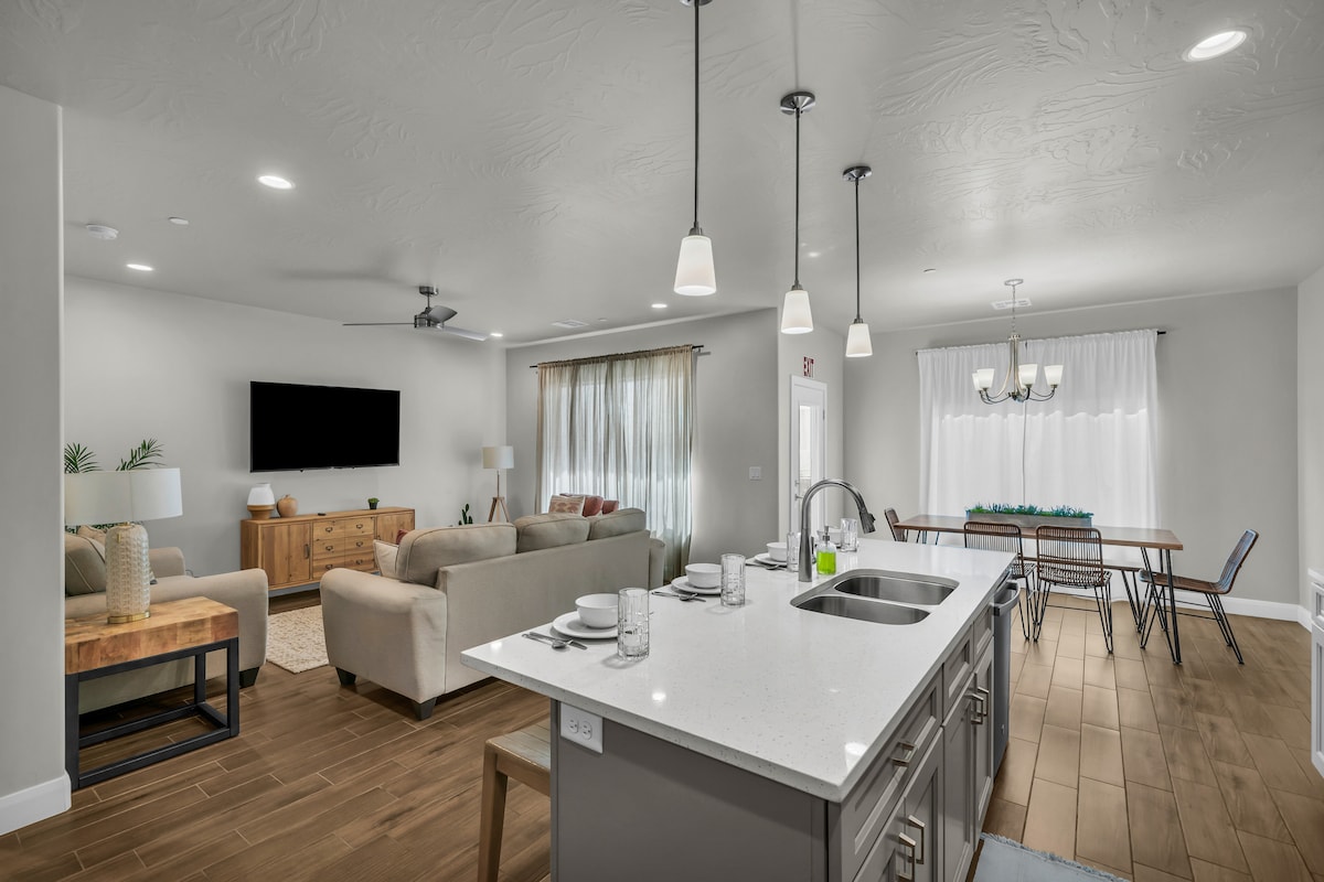 Brand new townhome that is sure to become your new favorite place to stay while exploring everything Southern Utah has to offer. This property is located only a short drive away from attractions such as Zion National Park and Sand Hollow & Quail Creek Reservoir. More information - Smart TVs in every room (e.g. Netflix, Hulu, etc.) - 2 Full Bunks, 4 Twin Bunks - 2 King Beds (Master w/ENSUITE Bathroom) - Garage parking for vehicles. - Private Upper Deck & Patio