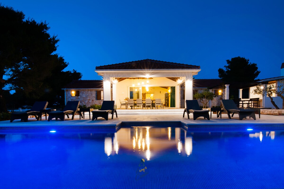 Charming exclusive use house with heated pool, sauna and spacious terrace with sea view. Located in the center street with private surroundings, great for holidays with friends or family vacation. Large parking space, private heated pool, outdoor shower and outdoor BBQ grill. 150m or 2 min by foot from the central sea front, shops and bars, 15 min by foot from the Zlatni Rat beach and 5 min by foot from the nearest beach. Free parking on the Zlatni rat beach included.