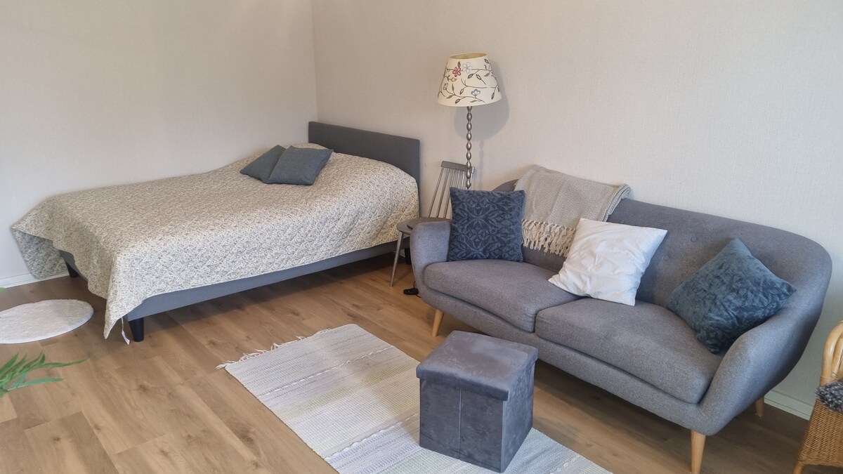Cozy, tidy apartment with its own entrance. Fully equipped kitchen. You can heat the sauna daily, cool off on the sheltered terrace, grill (gas) and a fireplace is available. Beds made in the bedrooms (160 cm, 120 cm). Living room sofa bed (140 cm). Travel beds for small children. Pets are welcome (please remember to inform us when booking). Linens, towels and final cleaning are included. The apartment is about three kilometers from the center of Kajaani in the direction of the airport.