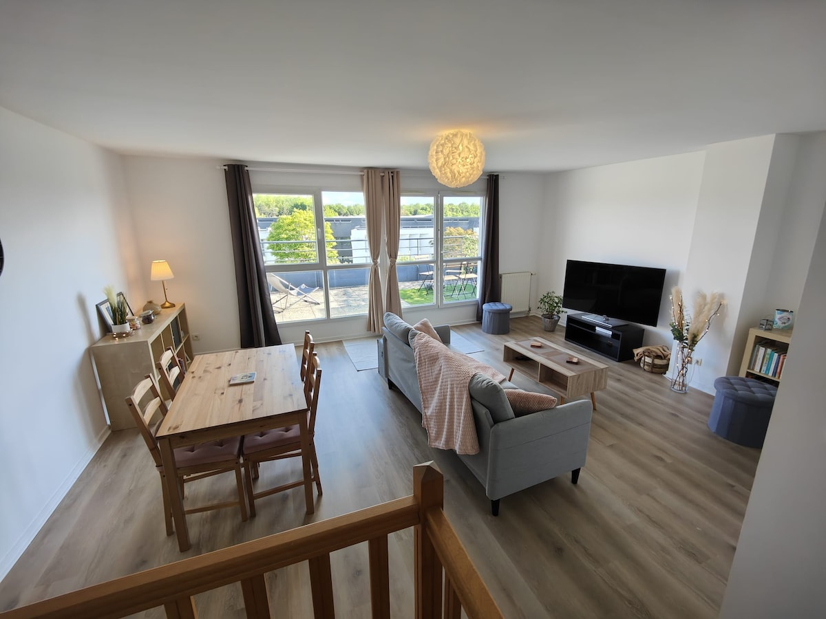 Charmant appartement duplex rénové de 72m2, idéalement situé. Ce logement lumineux et spacieux comprend deux chambres confortables, parfait pour accueillir jusqu'à quatre voyageurs. Profitez d'une cuisine entièrement équipée (avec une cafetière Bosch Tassimo), d'un salon chaleureux, d'une salle de bains et d'un balcon de 20m2 sans vis-à-vis. L'emplacement offre un accès facile aux attractions locales, aux restaurants et aux commodités avec le tramway au pied de l'appartement.