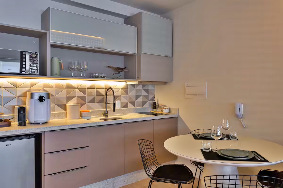 Batel em clima clean. Studio completo no Lifespace Curitiba, em frente ao Shopping Curitiba (do outro lado da avenida), com cama padrão hotelaria, sofá cama e cozinha integrada. Acomoda até 4 hóspedes com folga real. Piscina aquecida coberta, academia, sauna, sala de jogos, lavanderia coletiva e mercadinho no próprio prédio. Garagem inclusa na diária. Fechadura digital para check in sem atrito. Ideal para casais, famílias pequenas e viagens a trabalho.