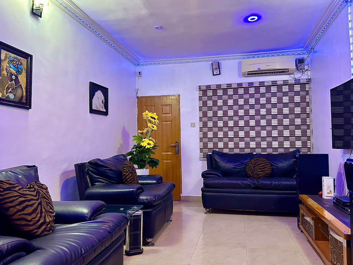 Standard ensuite room with semi orthopedic super king size comfortable mattress, modern bathroom with water heater. Unlimited fast WI-FI, 43inches Smart Tv in the bedroom and 55 inches Smart Tv in the sitting room, Netflix, YouTube, DSTV, Smoke alarm, 24/7 electricity with Band A supply frm the grid make my place unique wit no Blackout, Cctv, maximum security, 10min to International Airport and 5min to Domestic Airport. Sparkling clean, spacious and well organised Apartment for your comfort