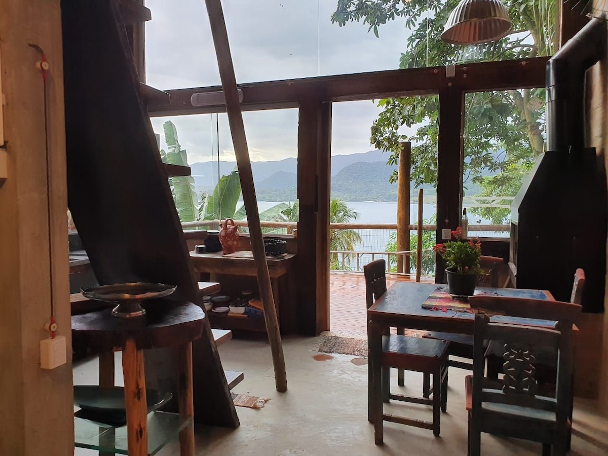 A bungalow built artistically in every detail... a bathtub open to the woods with a glass ceiling gives the feeling of being immersed in nature, with a centenary fig tree in front and many birds... intimate and welcoming in connection with Nature, in contact with this reserve area of the Atlantic Forest. The other hot shower is on the deck open to the woods and is delightful day or night, with a starry sky and moonlight.