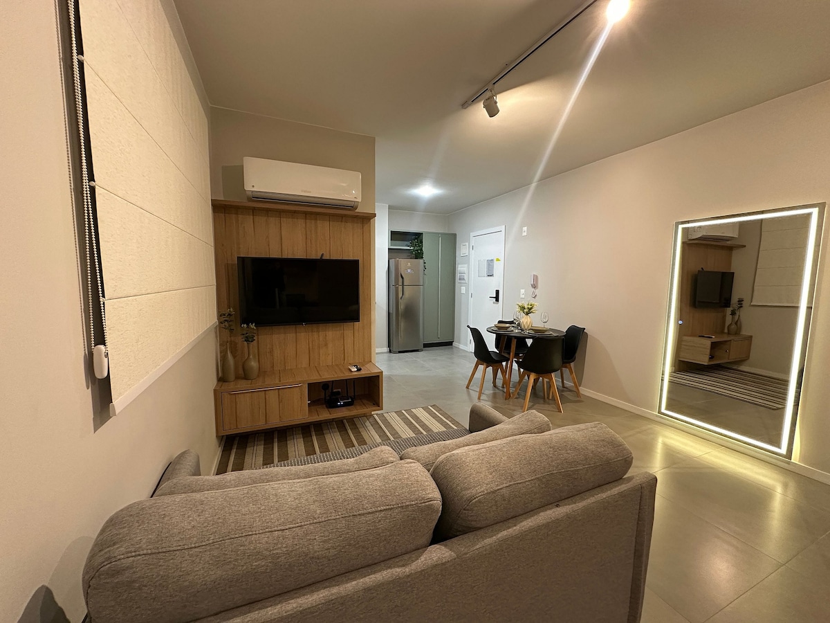 Apartamento de 40m, um quarto e uma vaga de garagem coberta. Hospede-se conosco e desfrute de uma vista incrível para a Serra e uma piscina na cobertura. O apartamento é novo, conta com móveis planejados e eletrodomésticos novos e modernos. Roupas de cama e toalhas das melhores marcas, limpeza impecável. Planejamos tudo pensando em hospedar você! O prédio está localizado na região central da cidade de Joinville, a 4min do Festival de Dança, 13min do Aeroporto, 8min até o Garten Shopping.