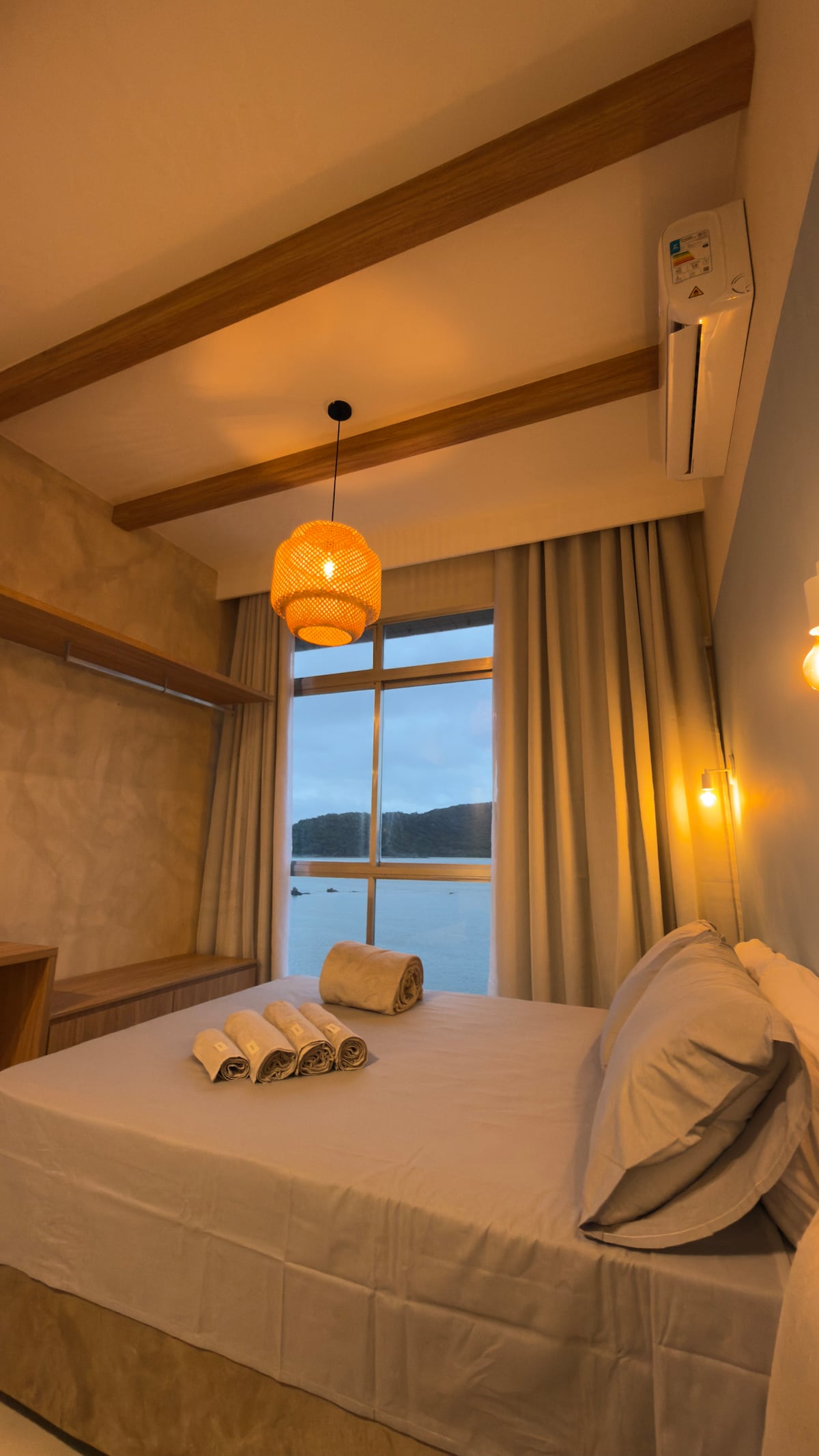 Deixe a rotina lá fora e venha relaxar com uma vista que vai te conquistar 💙 Temos quarto com cama Queen oriental com colchão Castor padrão hotelaria, sala de estar com sofá-cama casal (espuma D33) e smart TV de 43 polegadas com apps HBO Max, Disney, Prime e Apple TV, além de cozinha equipada. O espaço também conta com ar condicionado Split de 18.000 Btus. Além disso temos espaço para home office, com internet fibra de 500 MB, frente para o oceano. Espaço kids, salão de jogos e Pet Place 🐾