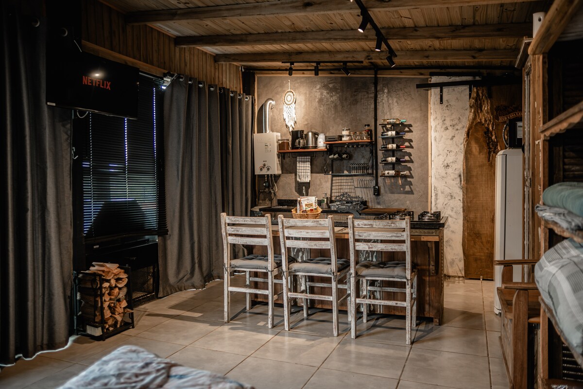 Desfrute de dias tranquilos em um chalé simples, de madeira rústica, ideal para quem busca sossego e contato com a natureza. Conta com piscina, churrasqueira, lareira externa e fogo de chão. No interior, há calefator e fogão a lenha. O mezanino possui duas camas de casal e ar-condicionado, com acesso por escada, podendo não ser ideal para idosos, crianças ou pessoas com mobilidade reduzida. 20 min da praia de Atlântida Sul e 1h de Porto Alegre. Ambiente aconchegante e sem luxo.