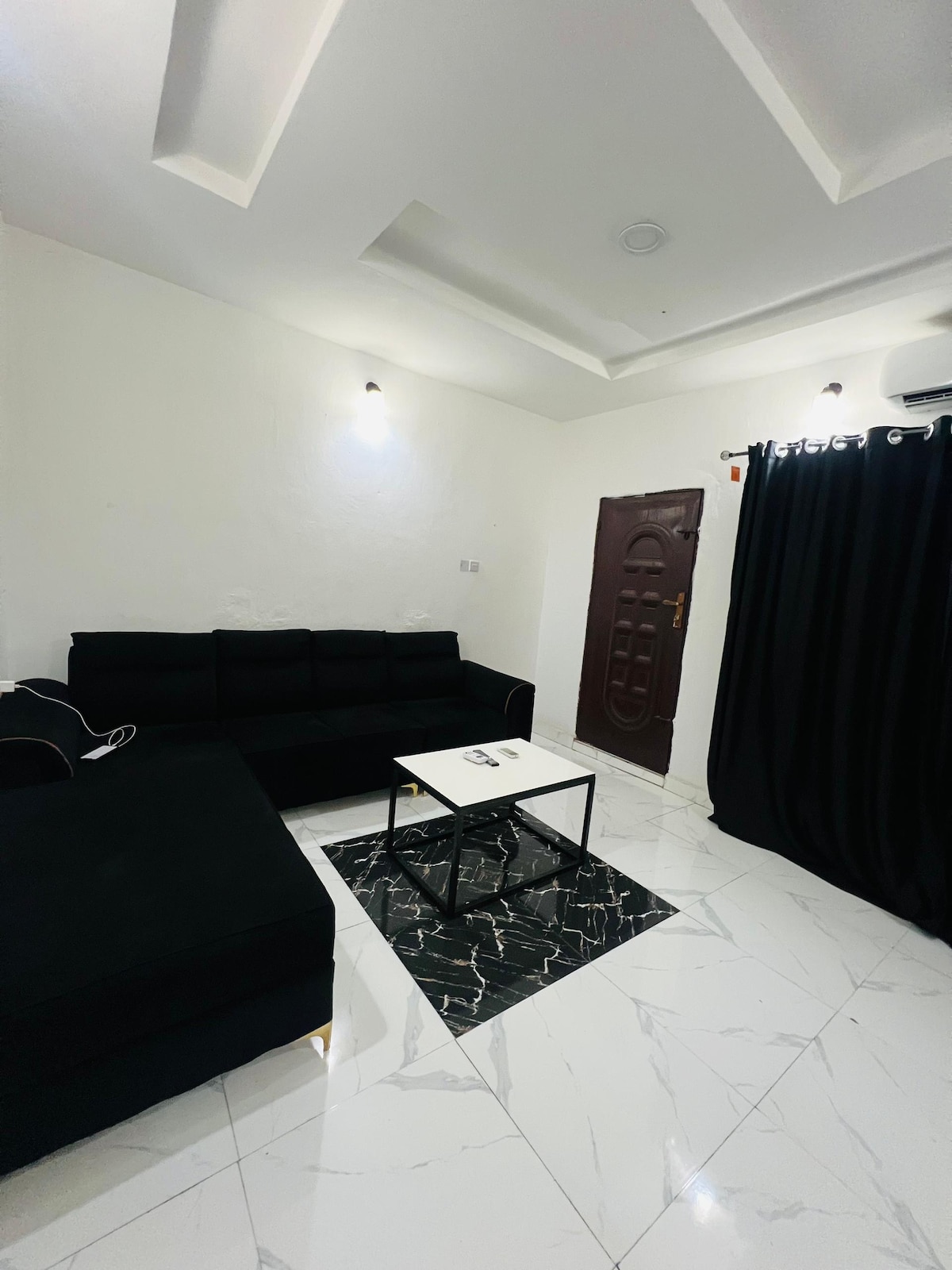 This cozy apartment features one bedroom with classy wardrobe and fans Sitting room with television air condition fans and work place Modern equipped kitchen with gas stove fridge freezer toaster kitchen utensils and microwave Bath room with shower situated in a gated community and built in a gated spacious compound with free parking and renowned security Provision for three exterior cameras supported with flood light .Solar powered 24 hours coolness backed up with 40 KVA generator.