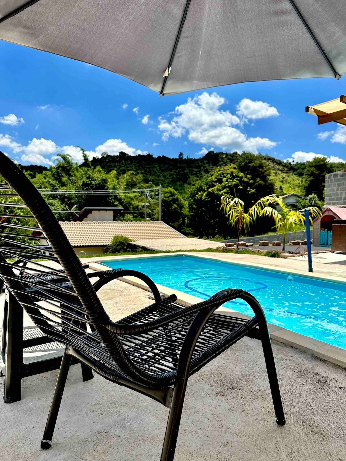 Chácara with panoramic view of the sunset in gated condominium. High style new house with two suites with balcony and air conditioning, living room with high height, internet, smart TV 50", Sky cable TV, sofa, gourmet area with barbecue, table of 3 meters, round table, stove and a refrigerator. Deck area, swimming pool, mini grassy field and hill pit. Frigobar in the upper suite. Rede with bank on the balcony of the ground floor en-suite. 8 cars parking area.