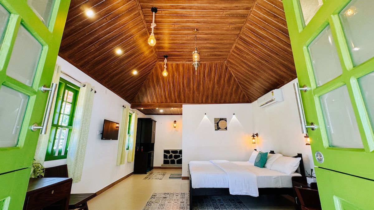 The cottage is simple, clean, and designed for comfort. The bedroom has a comfortable double bed with fresh linens, warm lighting, and charging points on both sides. Minimalist interiors with natural textures and a rustic Goan tiled roof add local charm. The bathroom is clean, functional, and well maintained, with a shower and essential amenities. This is a no-frills, nature-focused stay—ideal for guests who value cleanliness, comfort, and authenticity over luxury.
