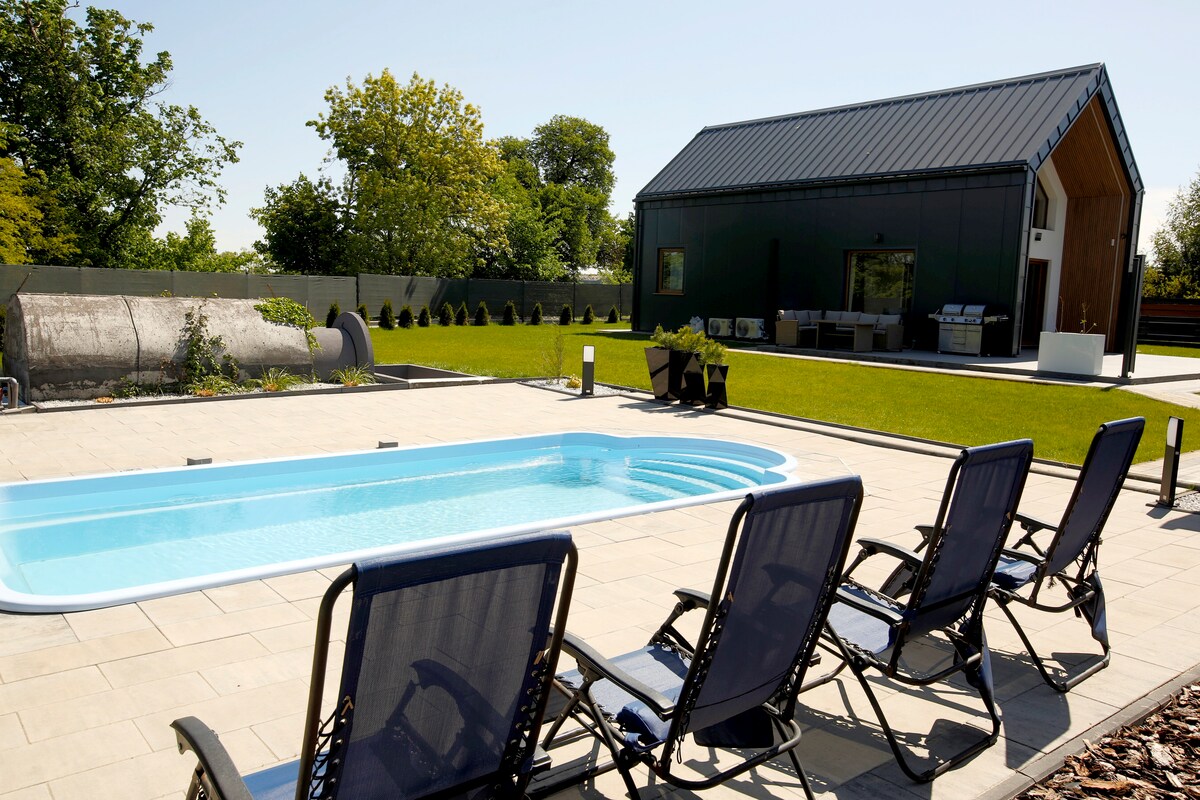 This modern interpretation of a traditional barn combines rustic charm with functional design, offering a spacious, cozy space. The apartment covers an area of 100m2 Terrace overlooking the sunset with access to a modern garden There is a sauna, an outdoor swimming pool and a barbecue in the garden. Perfect for walks and bike rides in the forest, which is 1 km from the cottage It is the perfect place to rest and relax.