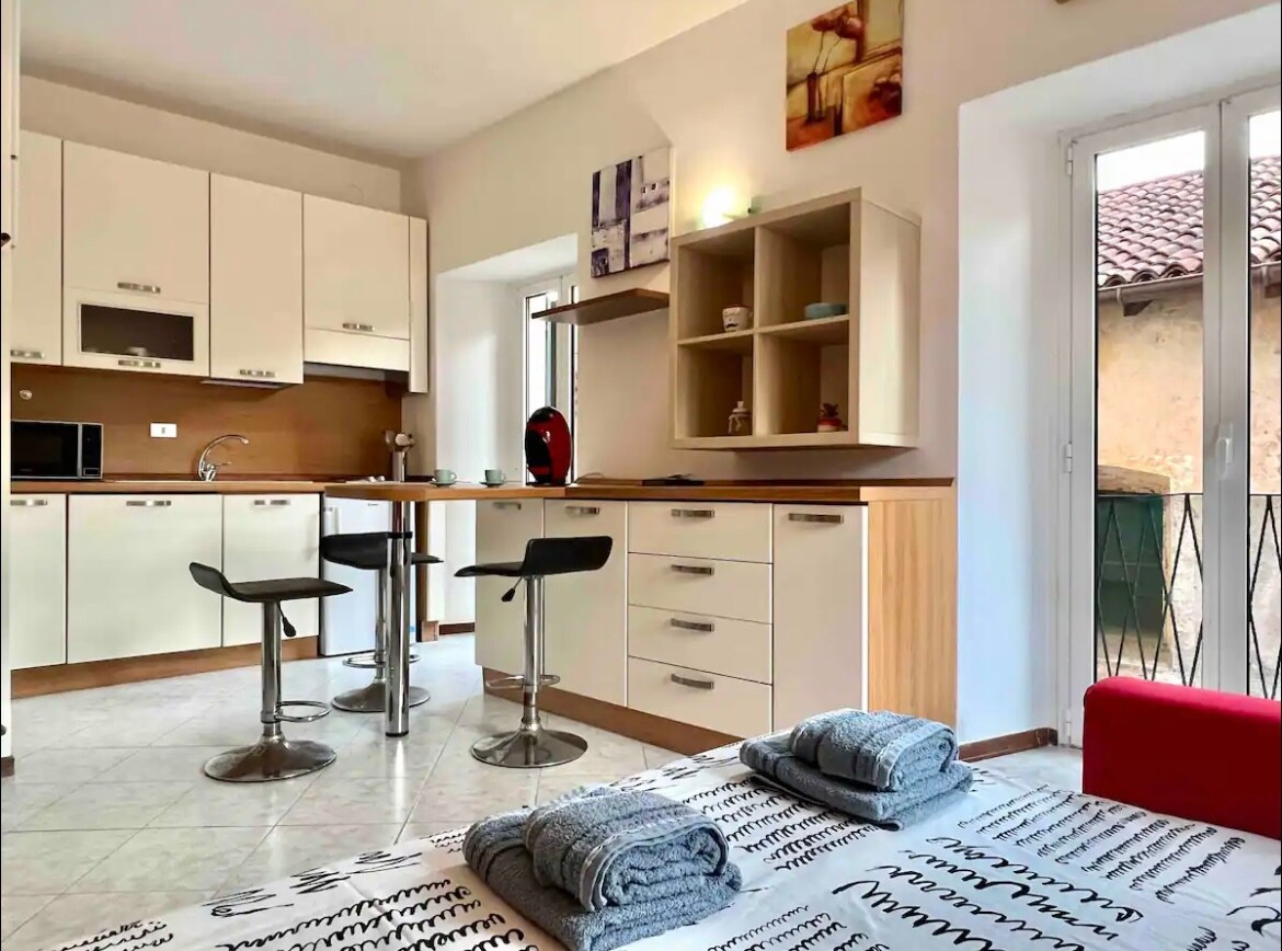 Elegant apartment, with terrace. Functionally furnished for travelers from around the world, brand new construction. The apartment consists of a cozy double bedroom. The kitchen, with a peninsula overlooking the living room, is equipped with every comfort (oven, fridge, cutlery/pot set and Nespresso coffee machine). All this is accompanied by a 4K Ultra HD TV, Smart TV (Netflix, YouTube, etc.), Wi-Fi connection and a comfortable sofa bed (140x200cm). 1.2 km from Lake Maggiore.