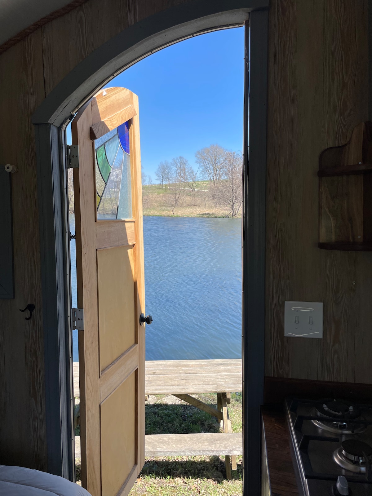 The true definition of rest & relaxation, this unique tiny house is situated on a three-acre pond suitable for catch and release fishing, kayaking, or stand up paddle boarding. Bring your gear and leave your worries behind. Built with special touches and details including stained glass windows and intricate woodwork, this tiny home boasts warmth throughout. Wake up to bird songs and coffee with the sunrise. After a day of fun, take a soak in the wood-burning sauna and relax by the campfire.