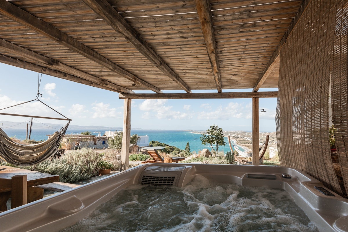 The Naxian View Luxury Suite with Outdoor Jacuzzi is located in Agios Polikarpos, Naxos, with incredible panoramic view of Aegean Sea and the temple of Apollo. In our place you'll relax in the outdoor jacuzzi, or in your private veranda, enjoying your drink. We are located 1,5km away from old town (about 20 minutes on foot), 1,8km from the port (about 25 minutes on foot) and 5 minutes away from Naxos town by car.