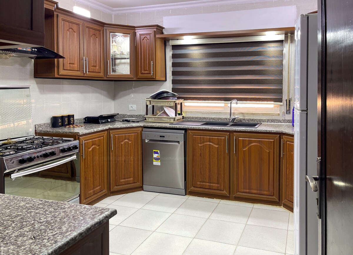 This 270m² villa features 2 connected flats(4 bedrooms,7 beds,3 bathrooms) with 3 large salons – perfect for families. Enjoy full privacy in a peaceful area just 4 min to Irbid Mall and city center,and 8 min to Yarmouk University. Highlights: Ultra-convenient – Arabella Mall, irbid city center & Al Hasan Stadium all within 5-8 min walk Serene escape– Quiet neighborhood with cooling breezes, yet steps from city life Spotless & spacious – High ceilings, natural light, and room to relax. Fast Wifi