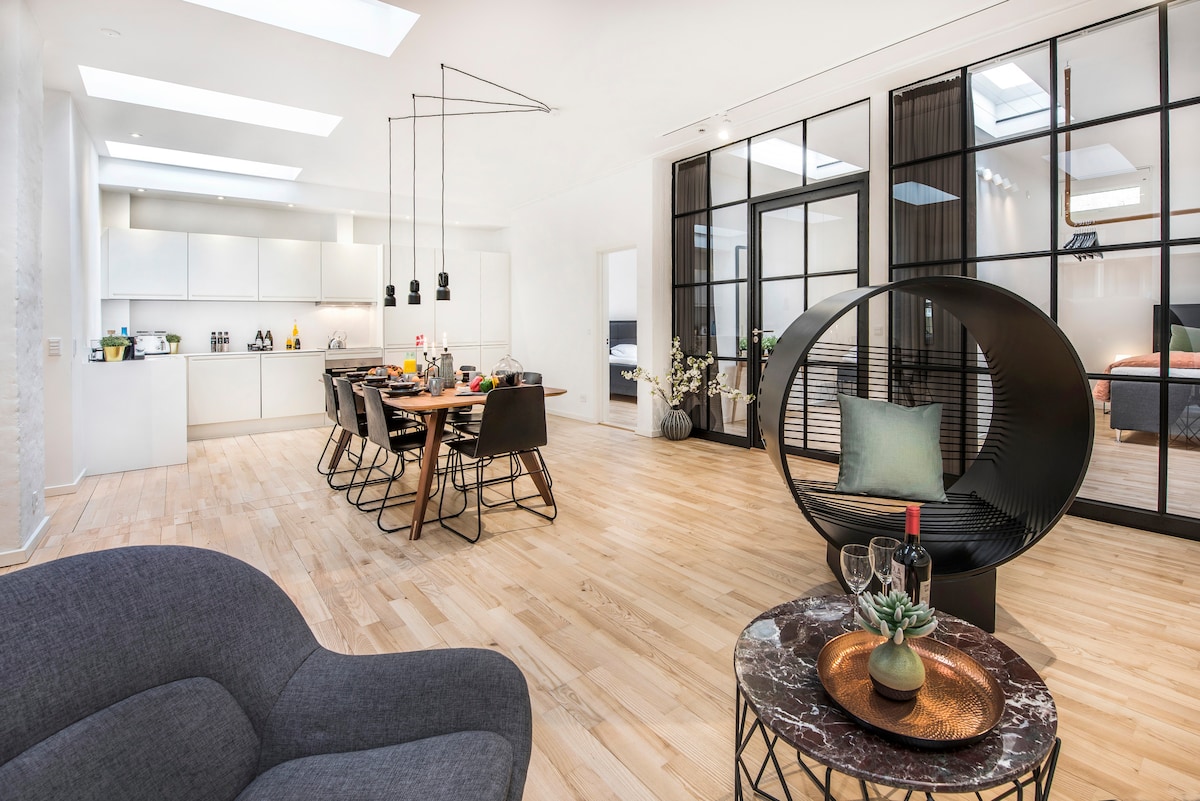 This apartment has a lovely calm and cozy vibe surrounded by amazing views of Carlsberg and Copenhagen to the sea. We love living with beautiful design objects and some completely natural elements in between. This is a place to be relaxed, creative, cooking or just contemplating the cityscapes. Located in the attractive old brewery site of Carlsberg filled with heritage buildings, squares, cafes and restaurants. Surrounded by beautiful parks, the hip Enghave Plads and the vibrant Vesterbro.