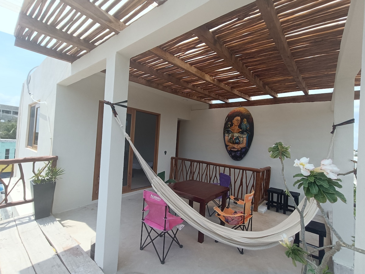 Enjoy comfort in our private apartment 03 with a comfortable double bed and located on the magical Holbox Island surrounded by a quiet, central and cozy atmosphere. It has the services of wifi, equipped kitchen, air conditioning, fan, closet, TV, private bathroom with hot water, towels, soap, shampoo, table and chairs. 2 minutes from the ferry and 5 minutes from the ATM, shops, pharmacies and restaurants. The beach and central park are an 8-minute walk away. Ideal for couples.