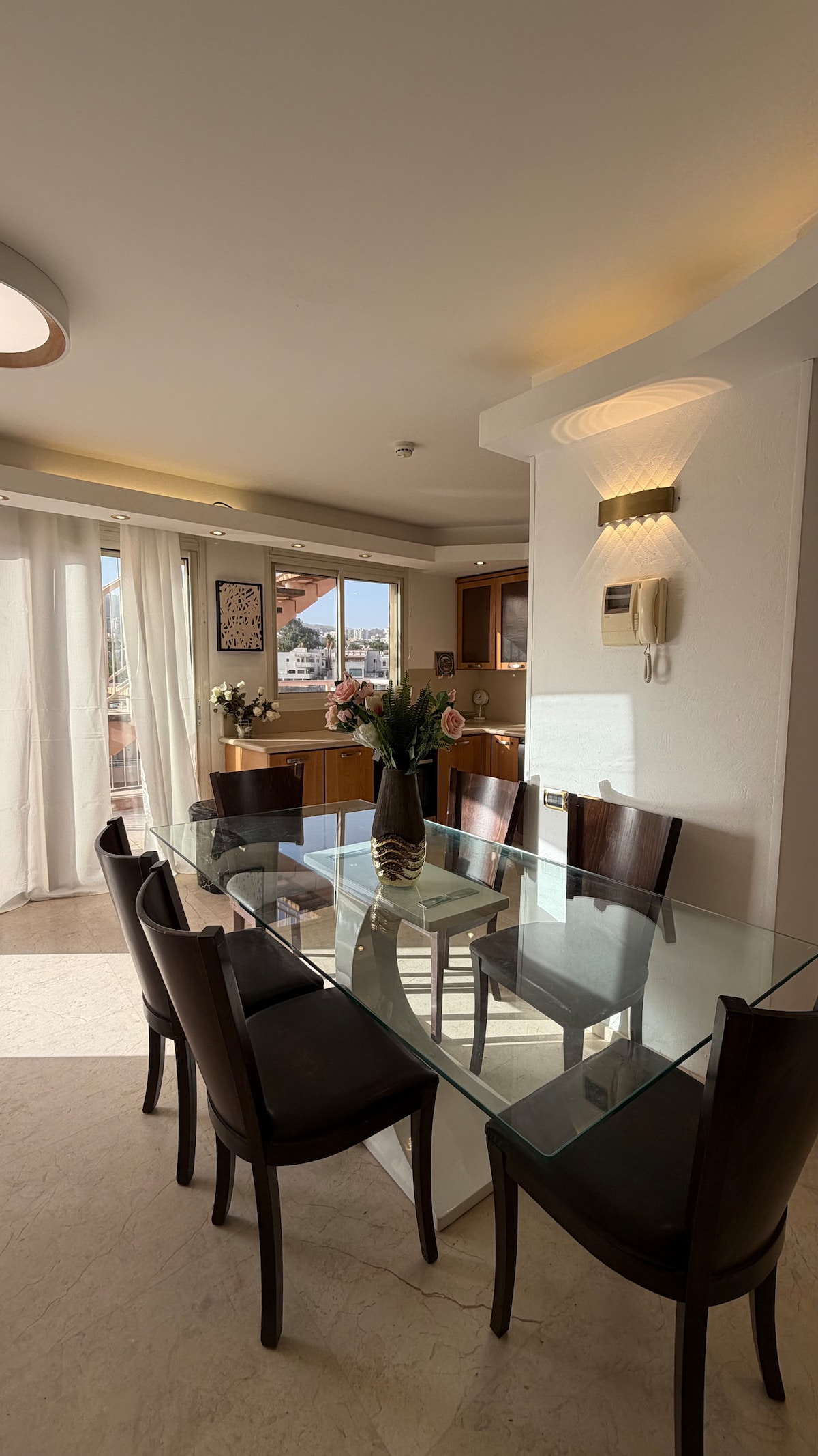 Private luxury apt with sea view at a beautifulll resort. Master bedroom & living room have large windows over ocean view, kids bedroom with two twin beds. The complex includes free swimming pools, jym, squash, tennis cour, lush well-kept gardening and playgrounds. 5 min drive from the old city & There are 2 big shelters in each level of the building. The apt is 15 meter from each of them.