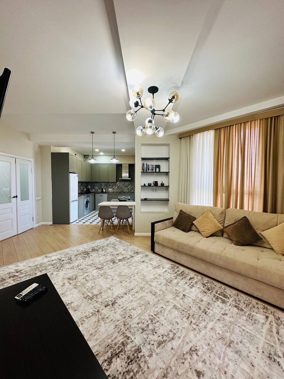 Cozy, Luxury Apartment for a comfortable stay in the freshly made Elite House located in the city center. The house is striking both day and night. At night, the building shines very beautifully, can be seen even from a long distance. On the ground floor of the building, there is a 24/7 supermarket & pharmacy, GYM, beauty salons, bank. The apartment is very bright and comfortable with all amenities. The building is safe and guarded around the clock, there is also a playground on the territory.