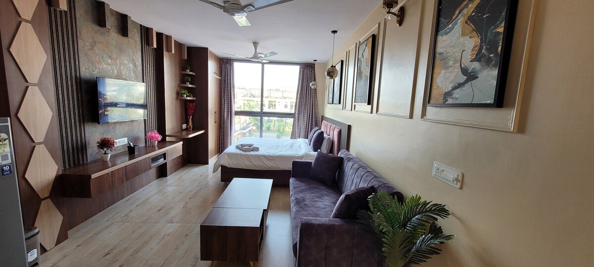 This 1BR studio Apartment is a perfect match for those couples and solo travellers looking for a peaceful and luxurious stay experience. Located at just 5 minutes from Jaipur Railway Station and just minutes away from other major attractions in the city center- this place doesn't fail to impress it's guests. You also get access to a small GYM as well as a terrace lounge area with amazing city views.