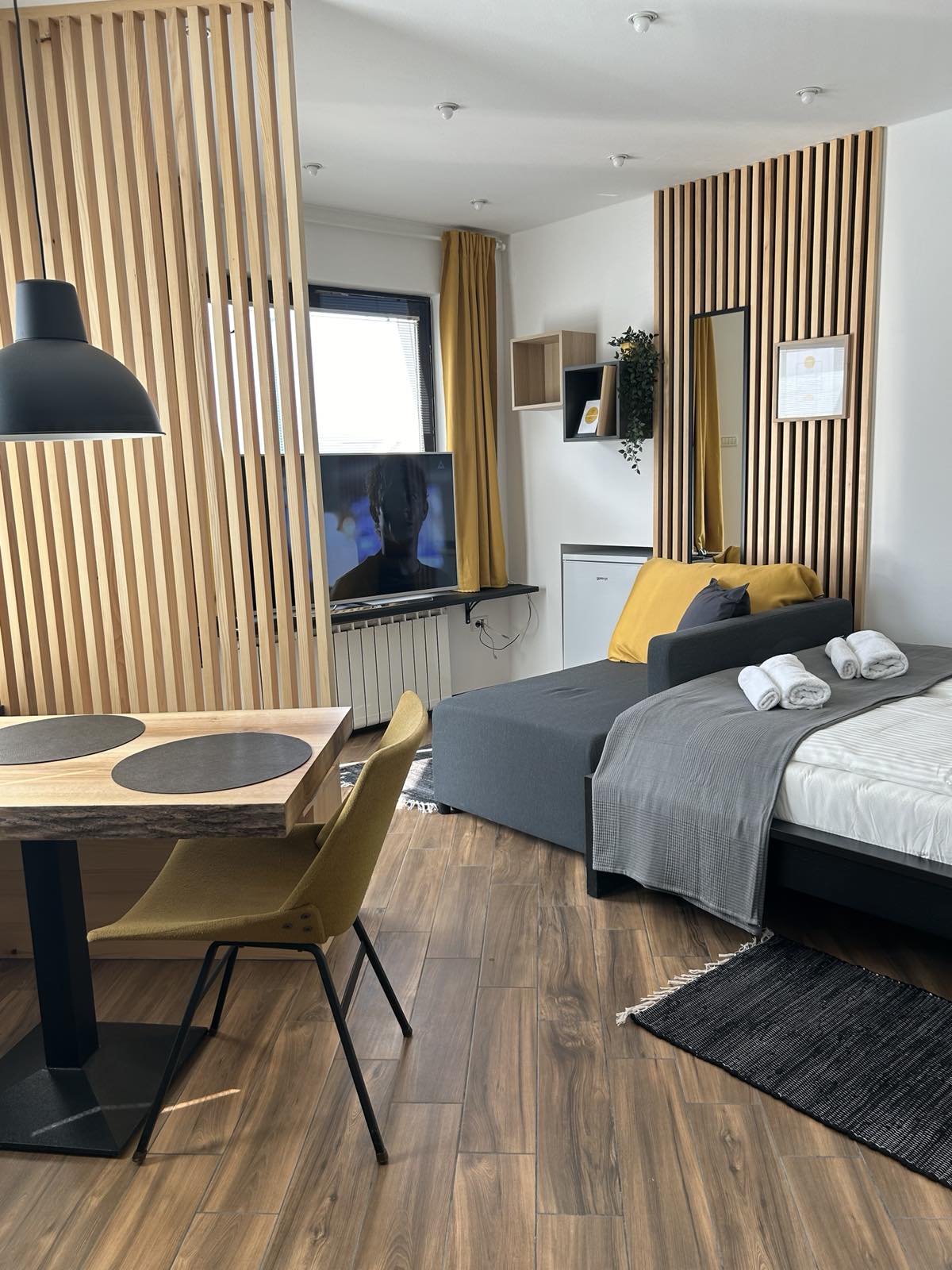 At the end of the street in Postojna is a unique apartment with a hint of yellow, modernly equipped with everything you need for a trip. Inside you will find a spacious bathroom, a fully equipped kitchen, a comfortable bed and a sofa bed (80x190 cm), suitable for a teenager or child. There is a seating area outside with a view of Postojna and Sovič.