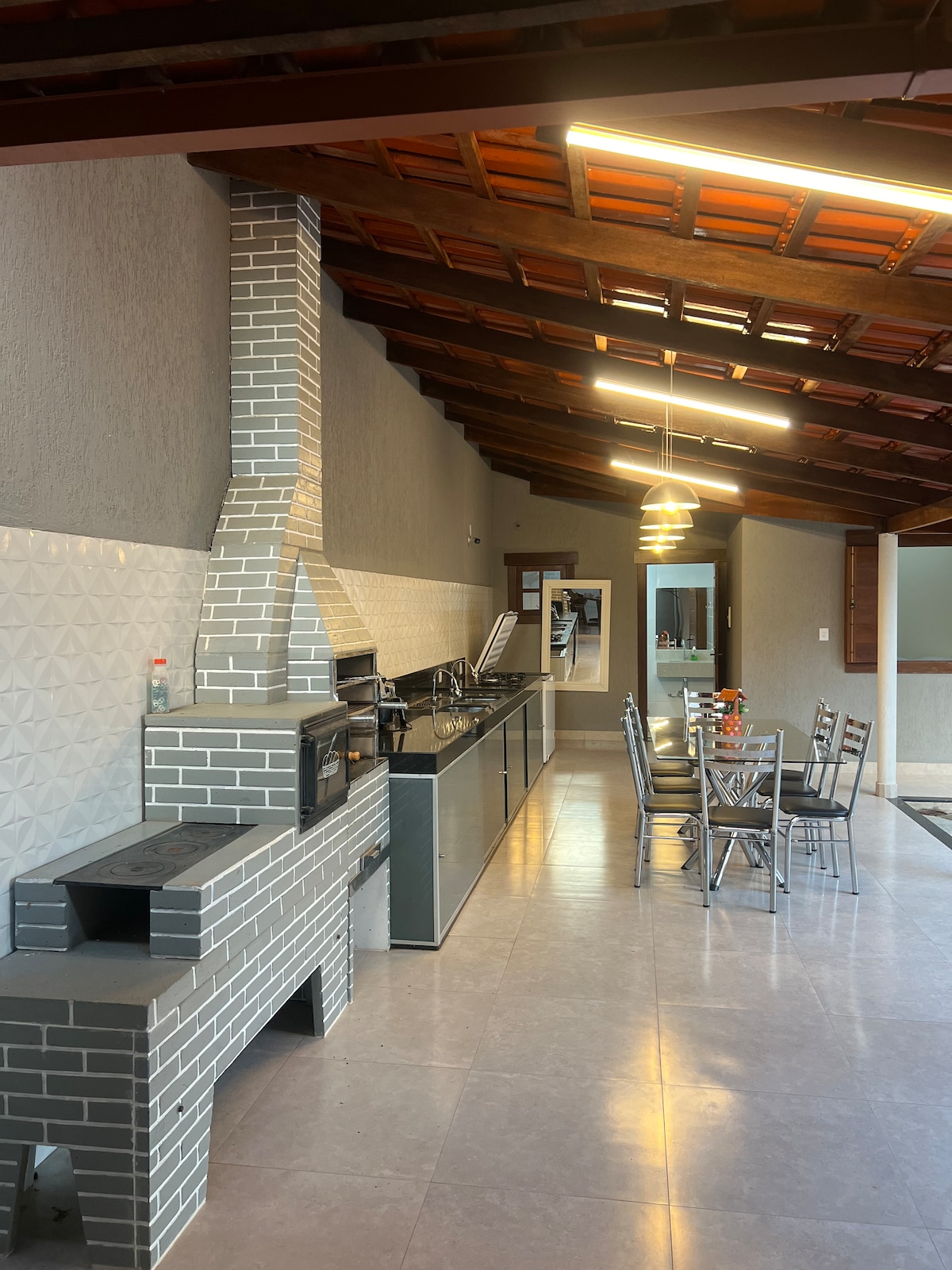 área de 160 m² com * cozinha gourmet * churrasqueira * wi-fi * sala de TV * mesa rústica 3 metros com 8 cadeiras * balanço * rede * 1 quarto com 2 cama de casal * piscina * hidromassagem * banheiro social externo com lavabo * 2 conjuntos de mesas com guarda Sol de piscina * 1 ilha com fogão embotido * 1 geladeira